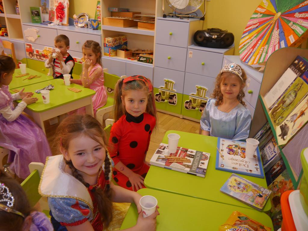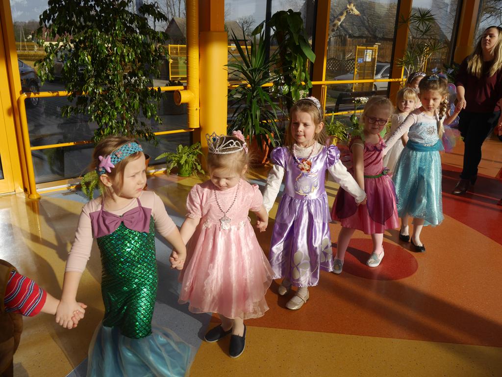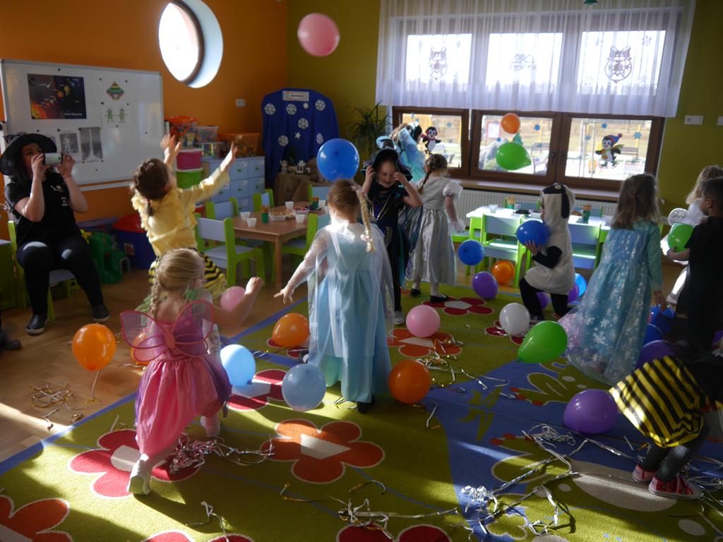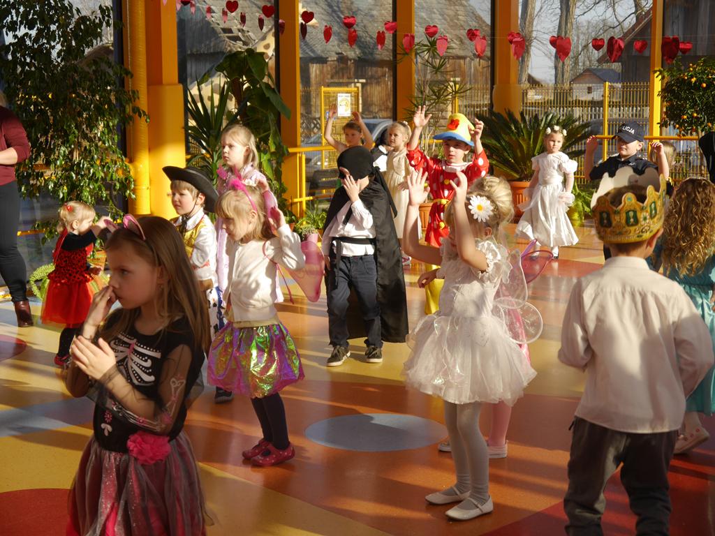 Przebierańcy świetnie bawili się, uczestnicząc z wielką ochotą w licznych konkurencjach, a skoczna muzyka zachęcała do tańca. Wspólna zabawa przysporzyła wiele radości naszym przedszkolakom, a to było głównym celem naszego balu. Niezliczone księżniczki, Elsy, towarzyszący im kowboje, policjanci, strażacy, marynarze, motylki, myszki, pszczółki, smoki, batmani, spidermani, a także inne postaci z kreskówek opanowały na kilka godzin nasze przedszkole.