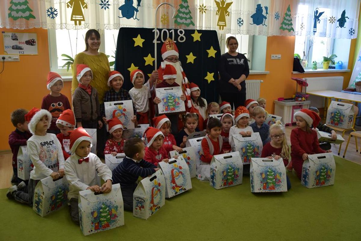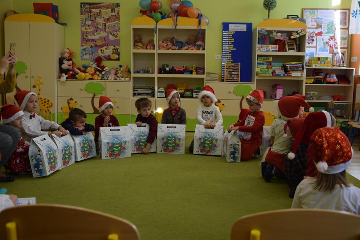 Przedszkolaki powitały długo wyczekiwanego gościa - Świętego Mikołaja. Worki wypchane prezentami dla przedszkolaków i sama obecność Mikołaja wywołały wielkie poruszenie i radość wśród dzieci. Święty Mikołaj rozmawiał z dziećmi, pytał czy były grzeczne i przestrzegał aby zawsze słuchały rodziców oraz pań w przedszkolu. Mikołaj podziękował dzieciom za bardzo ciepłe przyjęcie i ucieszył się, że czekało na niego tak dużo dzieci. Kiedy nadeszła chwila rozstania obiecał, że za rok o tej samej porze ponownie zawita w naszym przedszkolu !