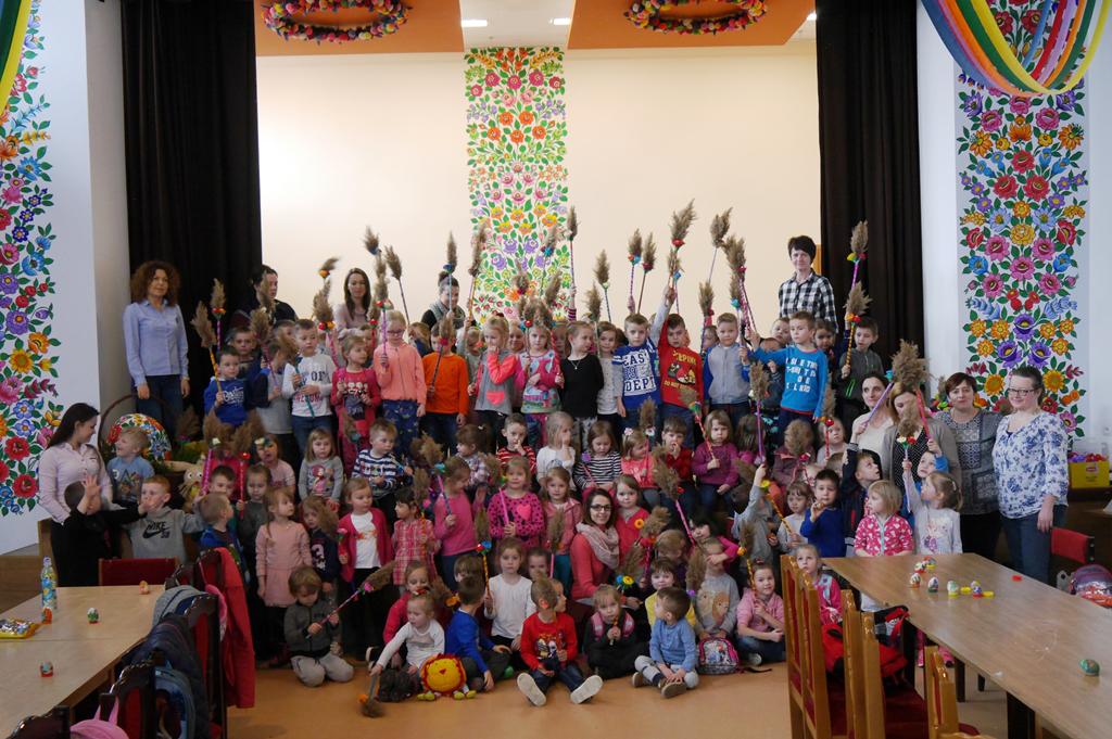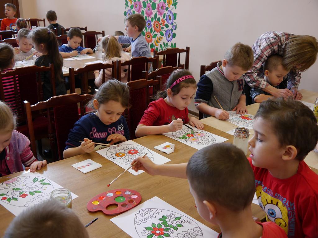 W Domu Malarek przedszkolaki wzięły udział w wielkanocnych warsztatach plastycznych. Pod czujnym okiem artystek ludowych dzieci malowały wzory kwiatowe na kartkach, inspirując się pięknymi zalipiańskimi malowidłami. Następnie cierpliwie ozdabiały farbami drewniane pisanki i wykonywały wielkanocne palmy. Prace były niepowtarzalne. Każdy uczestnik warsztatów mógł zabrać swoje dzieła - obecnie zdobią nasze przedszkole.